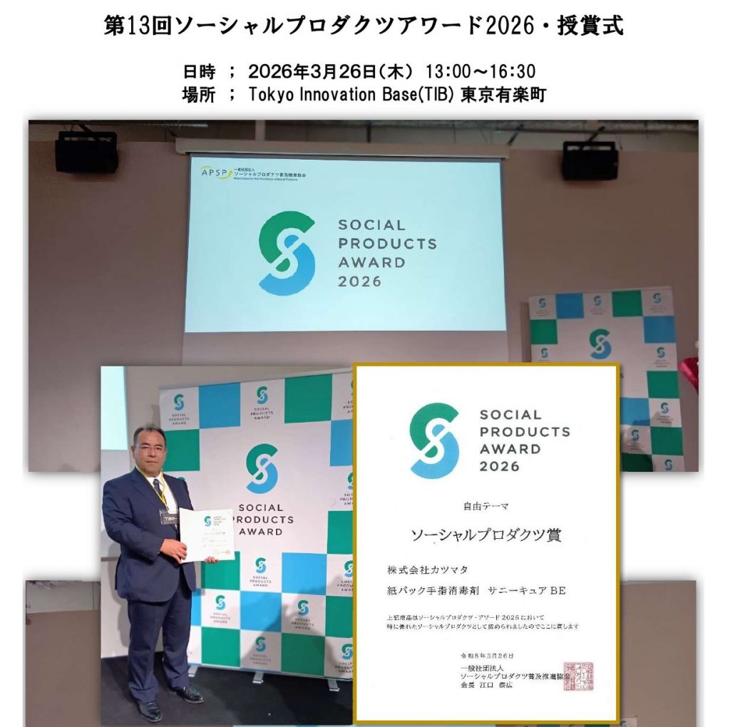この度、弊社オリジナル商品「紙パック 手指消毒剤 サニーキュアBE」が授賞しました。皆様に深く感謝申し上げます。